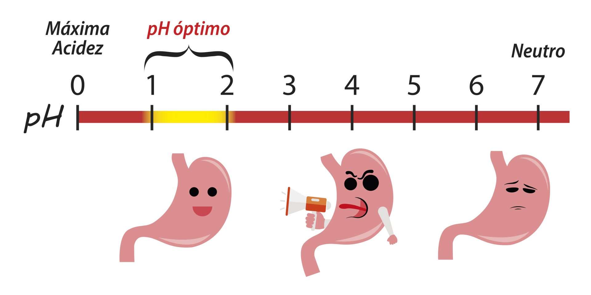 Cada día, el jugo gástrico que producimos se compone de unos 2 litros de ácido clorhídrico (para descomponer las proteínas y matar los microorganismos patógenos), además de mocos para proteger la pared del estómago y finalmente de enzimas (pepsina y lipasa) para la digestión. ¡Cada uno tiene su lugar, cada uno tiene su papel, cada uno tiene su propio pH!