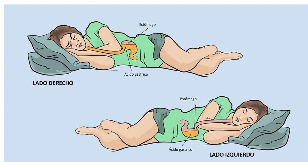 Duerme sobre tu lado izquierdo. Si no lo has notado, nuestros cuerpos no son simétricos aparte de nuestros dos ojos, oídos, brazos y piernas. Nuestro estómago está a tu izquierda, con nuestro esófago inclinándose para encontrarse con él. Así, en caso de “debilidad” del esfínter esofágico, podrás contener mejor el ácido en el estómago. Esta es probablemente la mejor posición para dormir con ERGE.