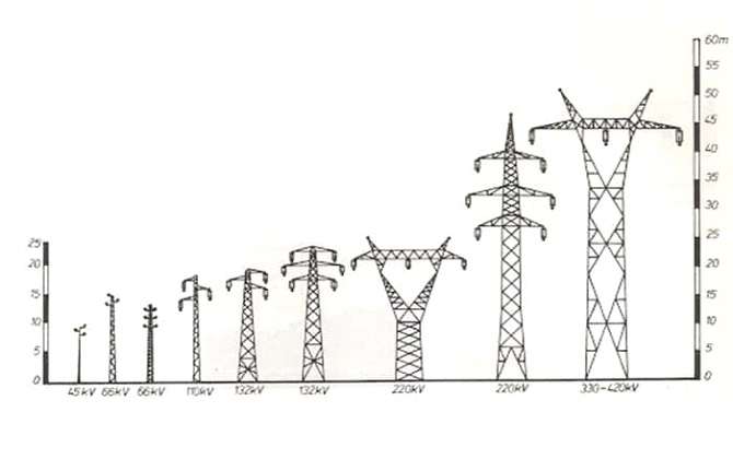 El alcance del campo eléctrico 50Hz (intensidad constante todo el año) depende directamente de la tensión de la línea. Existen líneas de alta tensión tipo 20.000V hasta 500.000V.