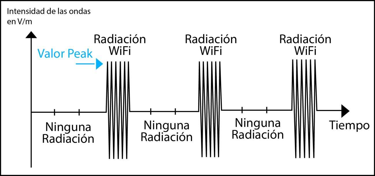 En el ejemplo arriba, una radiación electromagnética WiFi se emite una vez de cada cuatro. La intensidad de la radiación valor RMS es entonces 4x más pequeña que el valor PEAK.