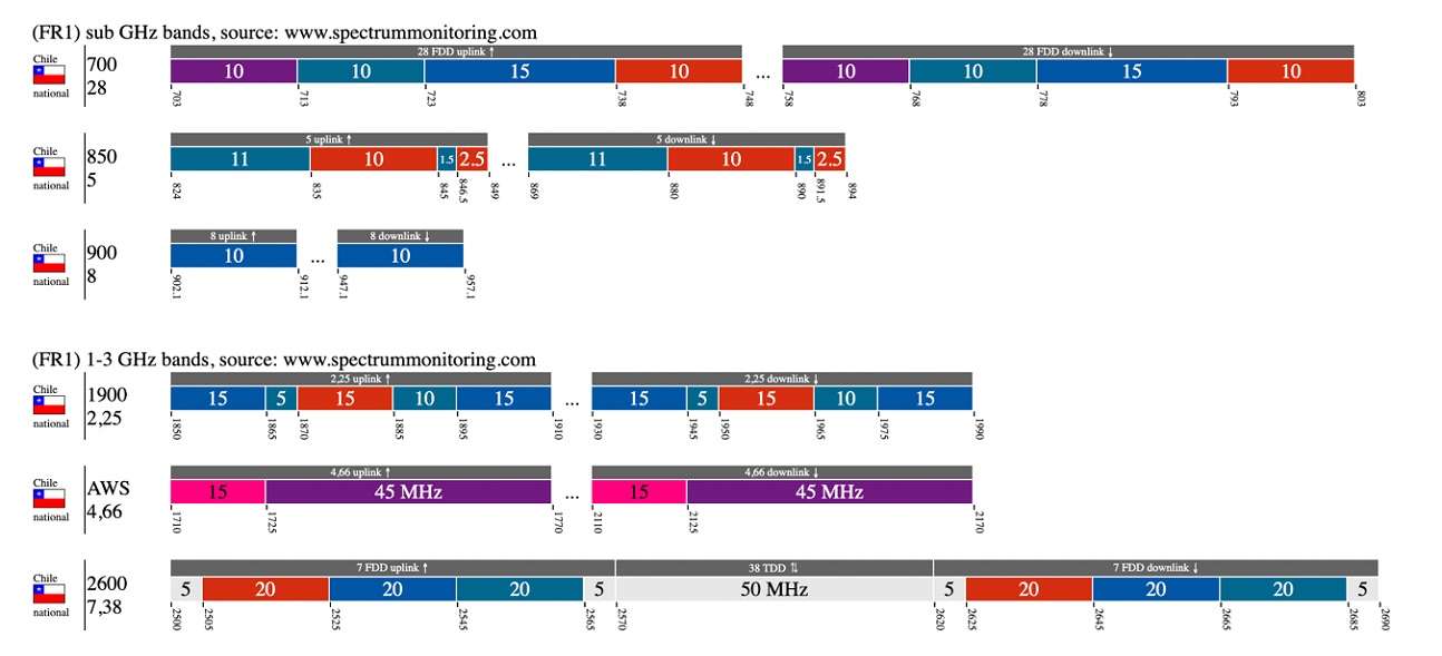 - alrededor de 700 MHz (banda baja para llegar más lejos)