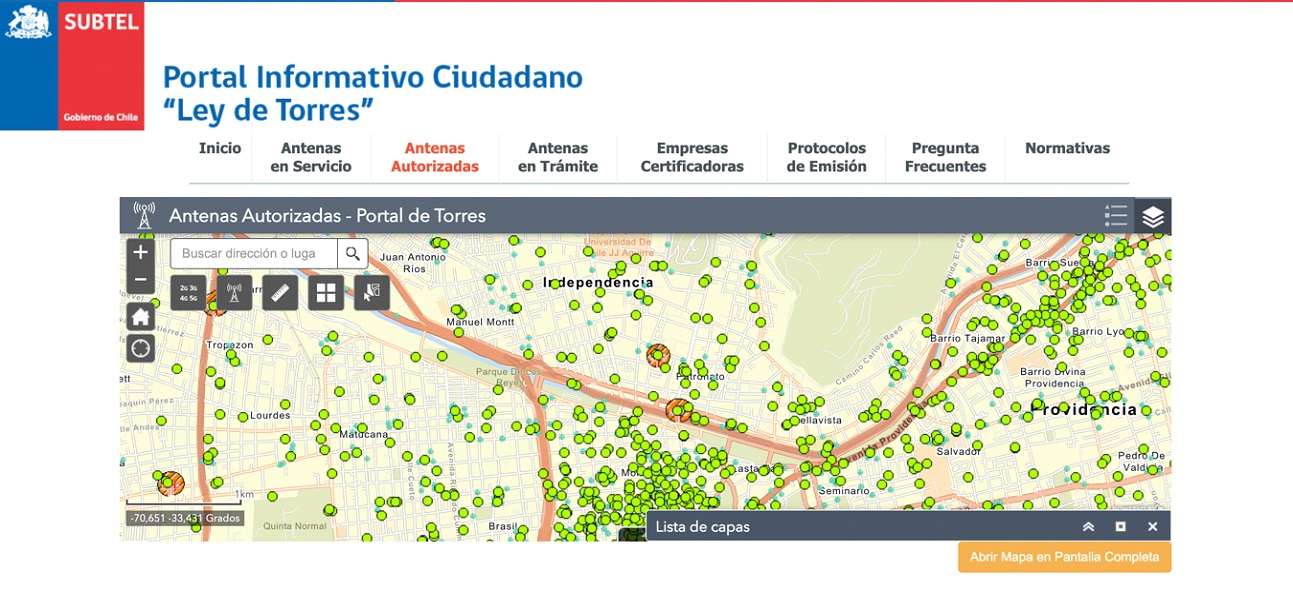 ⦁ Portal Informativo Ciudadano “Ley de Torres” en Subtel. Entrando su dirección podrá ver la ubicación de todas las antenas y medir distancia directamente en el mapa.