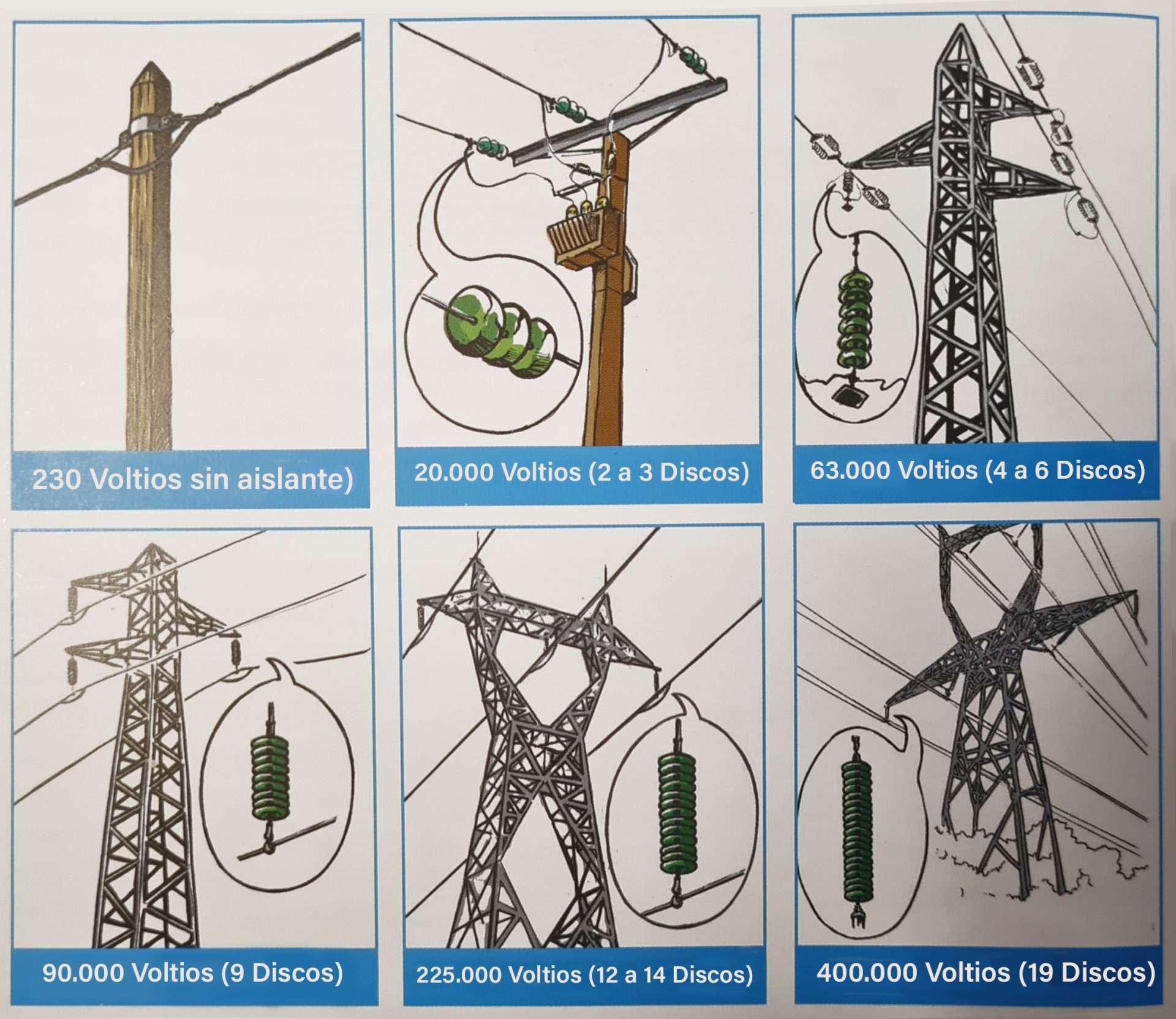 Se puede interpretar el nivel de tensión de la línea según el tamaño del aislador. Para conocer el tamaño del aislador, basta con contar la cantidad de discos instalados.