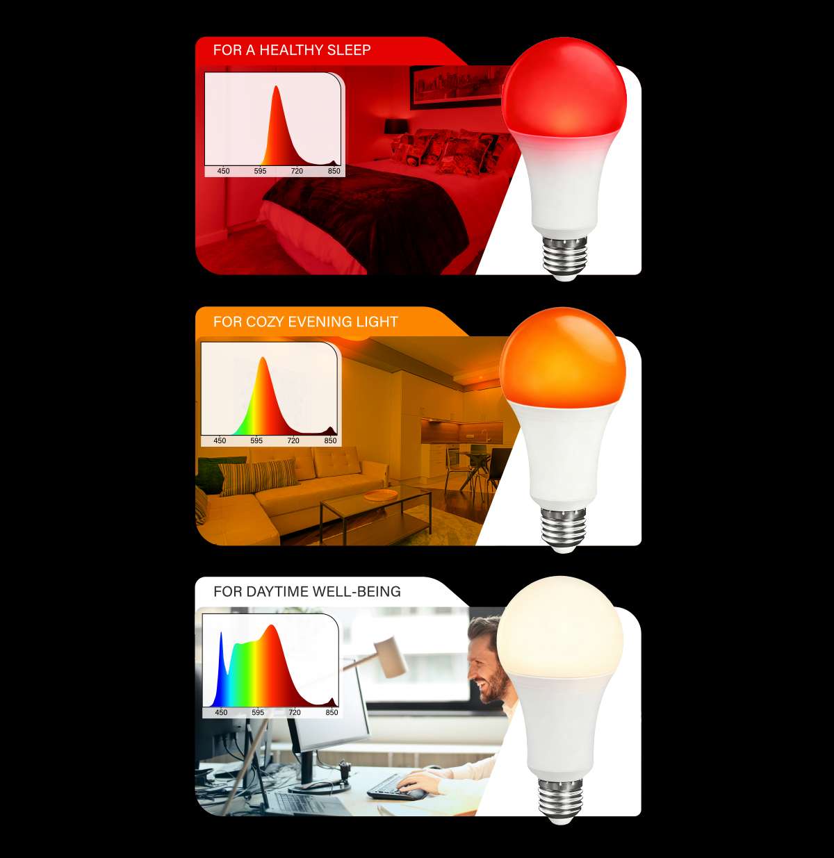 Una sola ampolleta, tres momentos del día, un solo objetivo: mejorar tu bienestar a través de la luz.