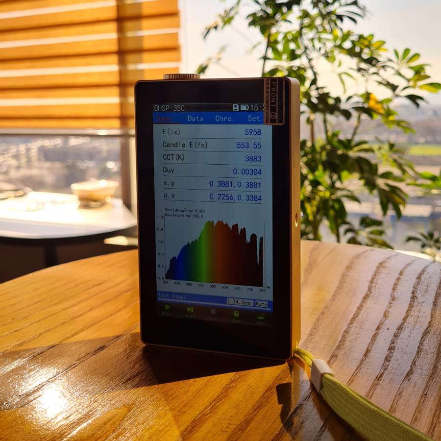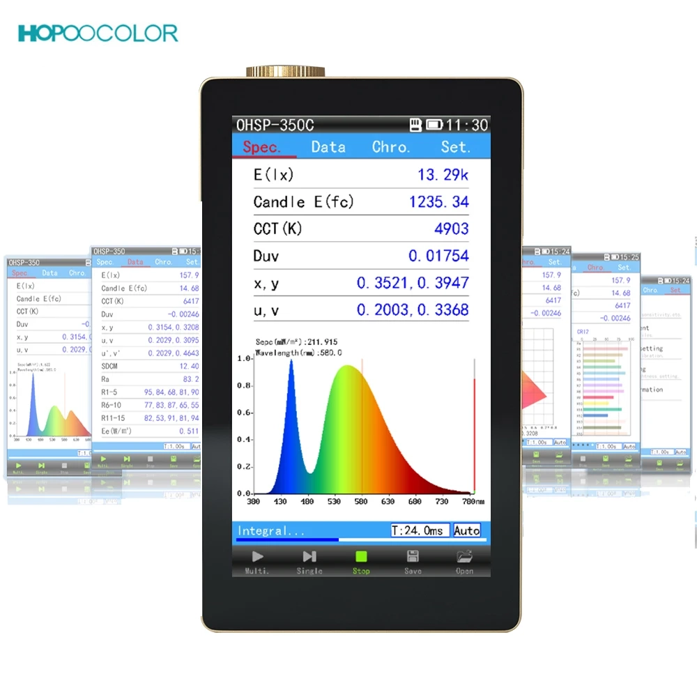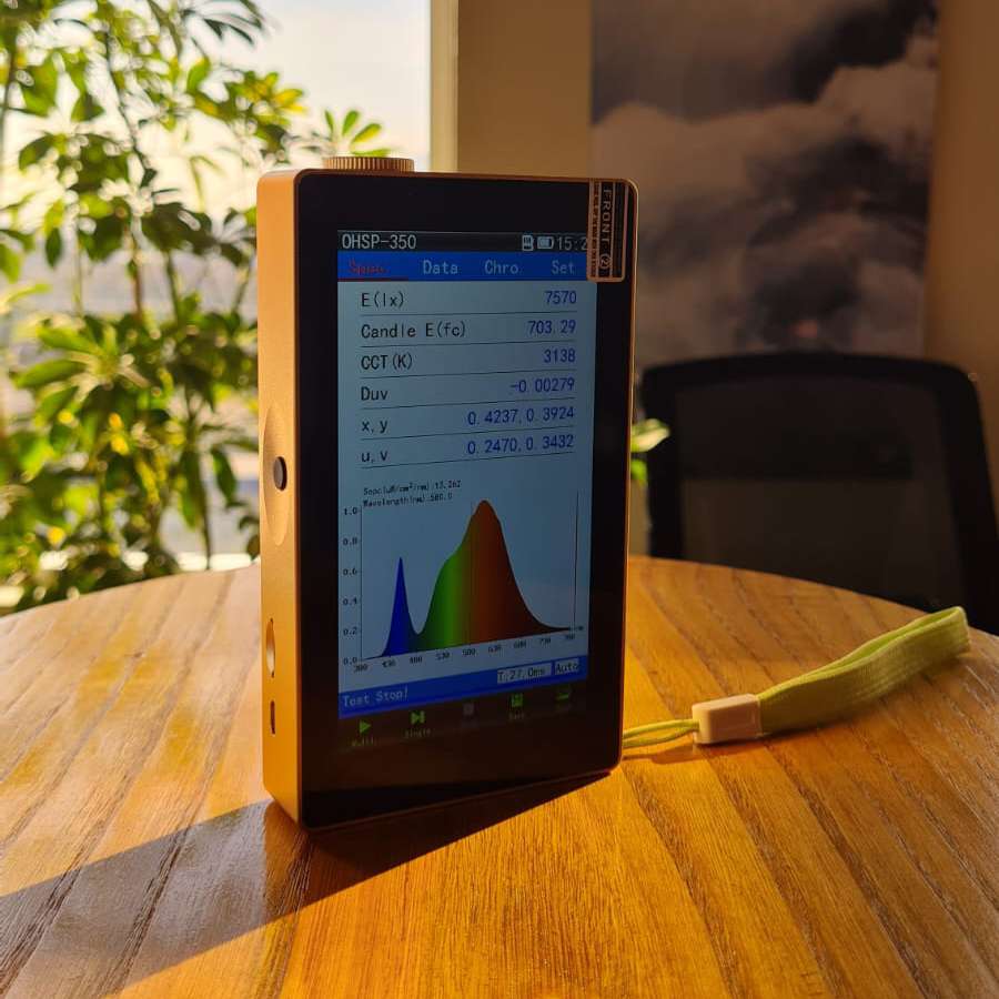 OHSP-350C Espectrómetro portátil de irradiancia espectral, espectro integrado, CCT, CRI, Lux, irradiación, etc., parámetros en uno. Con pantalla táctil de 5 pulgadas, visualización en tiempo real de los parámetros y curvas de medición, uso conveniente y rápido. No solo mide la fuente de luz LED de amplio espectro, sino que también mide CFL, la fuente de luz de espectro estrecho HID.