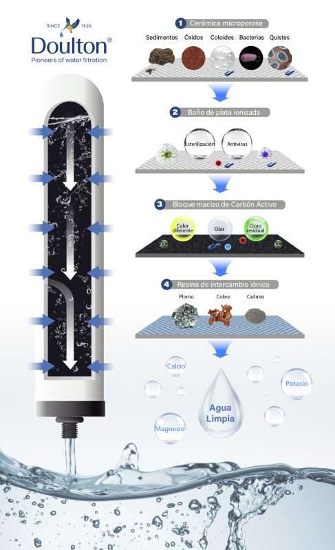 El filtro Ultracarb® marca Doulton® está compuesto por una cerámica microporosa de 0,5 micra con baño de plata ionizada y un núcleo de carbón activo macizo con resina de intercambio iónico, logrando eliminar impurezas, bacterias, metales pesados, cloro y otros contaminantes, para que disfrutes de un agua limpia, natural y de excelente sabor.