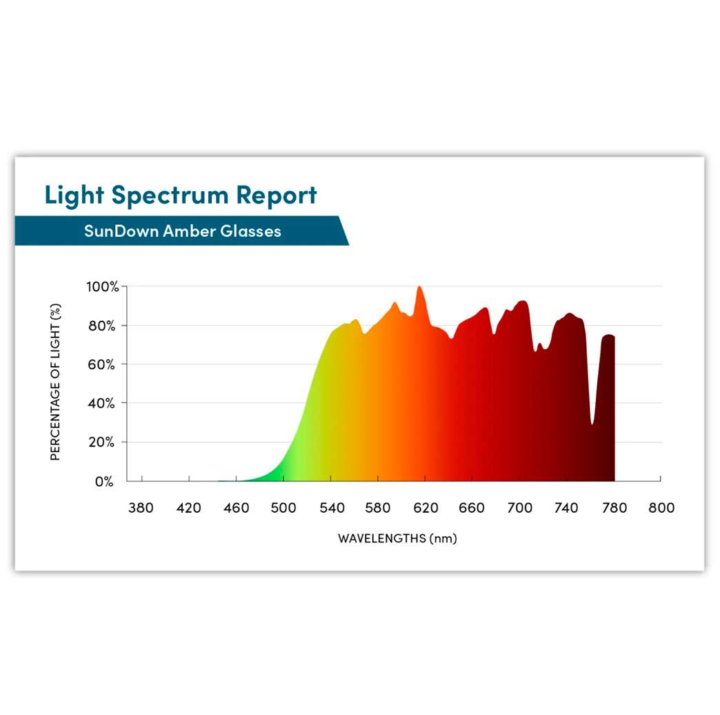 Las gafas SunDown Amber han sido diseñadas específicamente para bloquear el 100% del azul entre 400 y 500 nm. Su uso proporciona el equilibrio perfecto de un tinte ámbar más claro que permite una mejor percepción visual del color y, al mismo tiempo, sigue siendo eficaz para bloquear el 100 % de la dañina luz azul.