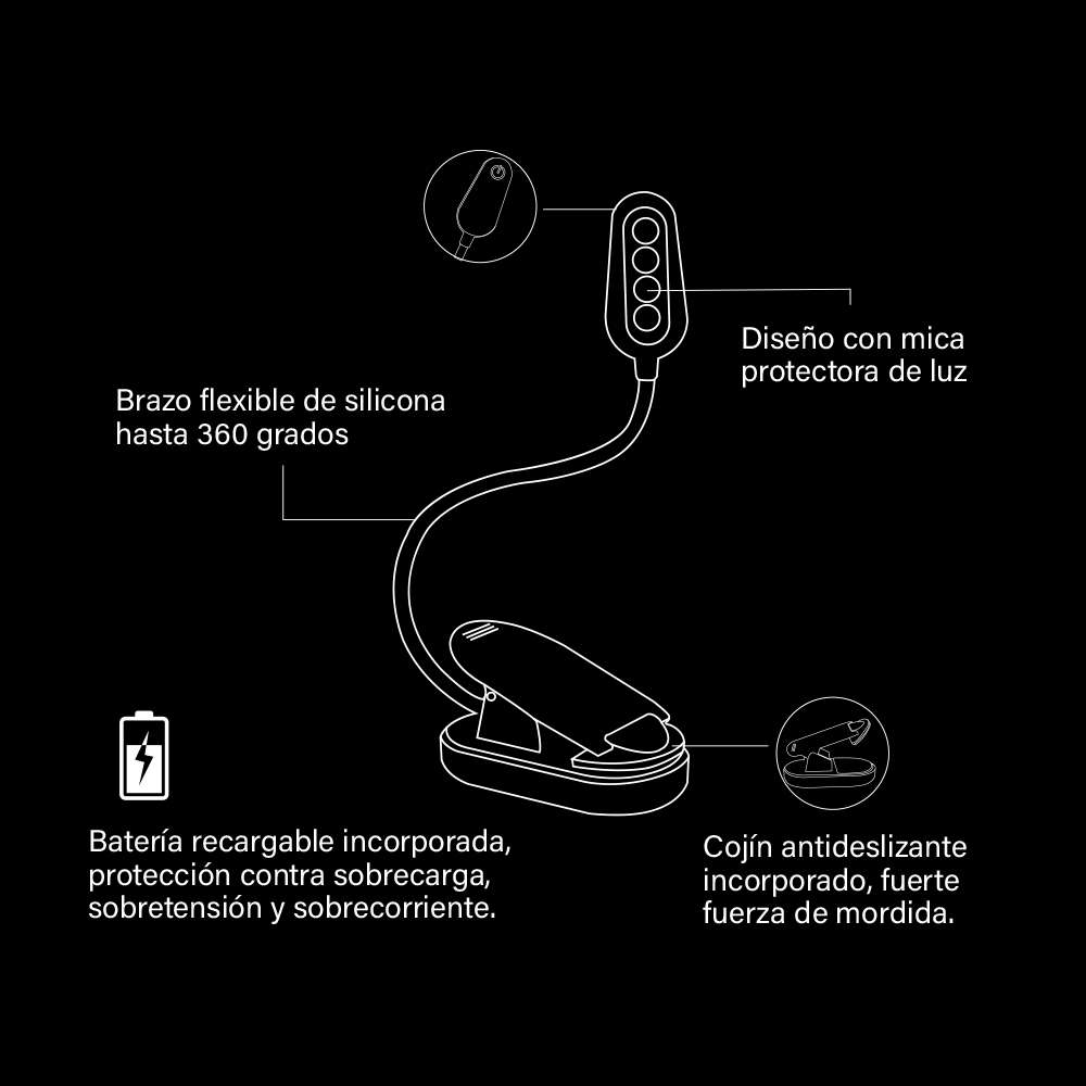 - La almohadilla de goma del clip protege las páginas de los libros contra daños y ofrece una sujeción segura y estable. El clip grande tiene una base plana para convertirlo en una lámpara de mesa, proporcionando una fuente de luz sin luz azul donde la necesites.