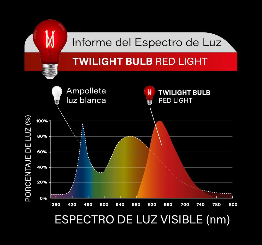 La ampolleta Twilight es una luz más tenue en la que no solo se elimina toda la luz azul sino también toda la luz verde. Ideal para lámparas de lectura, dormitorios, baños y cualquier lugar donde pases las últimas horas antes de acostarte. A pesar de su penumbra, ofrece amplia iluminación para leer y ver, emitiendo un relajante resplandor de color rojo. Es la mejor opción para garantizar un sueño reparador. Si priorizas la calidad del sueño, ¡estas ampolletas son imprescindibles!
