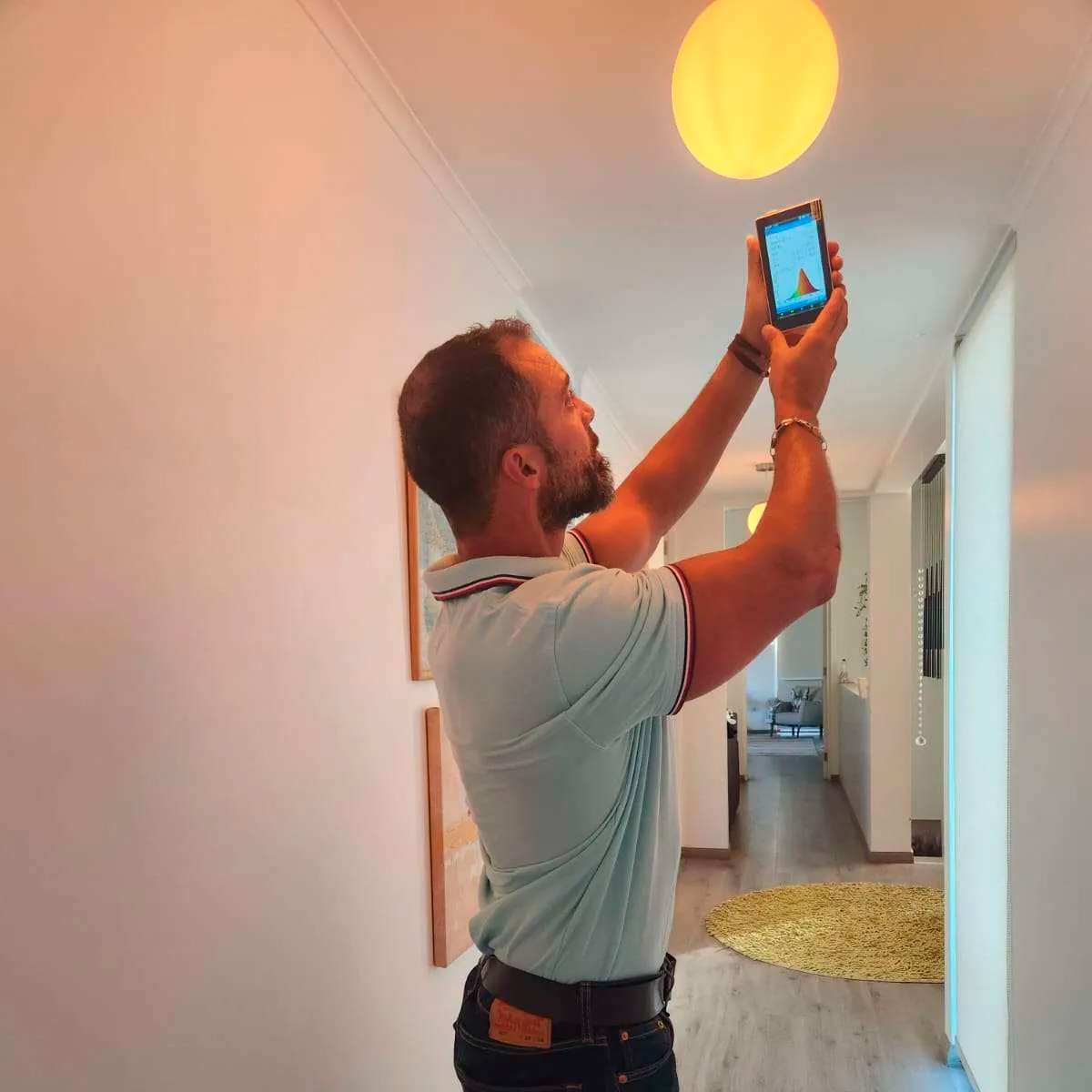 Utilizamos un espectrómetro de luz de gama profesional de amplio rango (230-850nm) para realizar un análisis preciso del equilibrio entre los diferentes colores. Esta práctica es de suma importancia para determinar qué tipo de ampolleta es más adecuada para cada espacio dentro del hogar. Es un paso inicial fundamental para preservar el ritmo circadiano y salvaguardar la salud de los ocupantes.